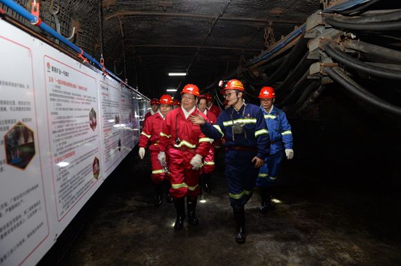 1月15日,何满潮院士一行在陕煤集团副总经理尚建选,黄陵矿业公司董事长范京道,黄陵矿业公司总工程师唐恩贤等矿区领导的陪同下,参观了公司近期科技创新成果,并深入到矿区井下智能工作面现场实地考察。何院士对智能化无人工作面的发展及成果给与肯定,并一键启动工作面采煤设备,亲自采下了平生第一刀煤。何院士对矿区项目研究与运用提出了相应指导意见与建议,指出矿区应向更好的目标迈进,除了无人工作面,要力争做到无煤柱、无巷道,形成“三无”矿区。何院士指出110、N00工法智能化是未来的发展趋势,希望黄陵矿区能够结合智能化优势,形成全国首家110工法智能化工作面。