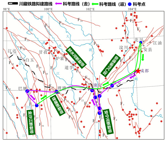 川藏铁路建设是实现两个百年目标和民族振兴的标志性工程。何满潮院士总体部署要求本年度科考以满足“地震带地质灾害调查及地壳活动性牛顿力监测台站选址设计研究”任务要求、服务川藏铁路建设为科考线路选择原则,选择了四川省境内川藏铁路沿线所穿越的龙门山断裂带、安宁河断裂带、鲜水河断裂带、理塘断裂带和金沙江断裂带等共计五条区域性活动断裂带为科考对象。