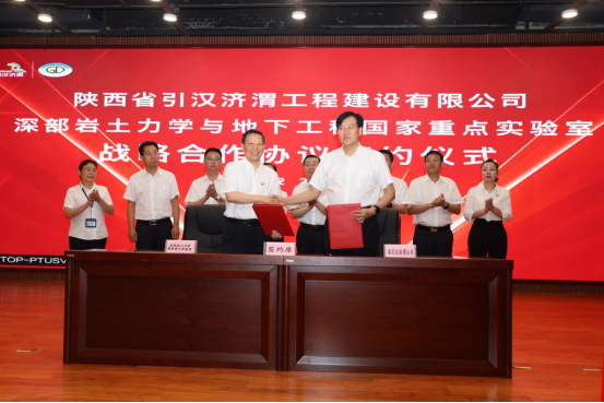 6月24日上午,深部国家重点实验室与陕西省引汉济渭工程建设有限公司战略合作签约仪式在引汉济渭公司2楼报告厅举行,深部国重实验室主任何满潮和引汉济渭公司党委书记、董事长杜小洲分别代表双方签约。随后何满潮院士作了题为“岩爆机理及其控制”的特邀报告。引汉济渭公司全体职工,参建单位中铁第一勘察设计院集团有限公司、中铁十八局集团有限公司、中铁隧道集团有限公司、四川二滩国际工程咨询有限责任公司、陕西大安工程建设监理有限责任公司、中国电建集团西北勘测设计院有限公司、黄河勘测规划设计研究院有限公司、中通服咨询设计研究院有限公司等项目负责人参加了签约仪式及报告会。会后,相关专家并就岩爆防治技术研究进行了进一步交流和研讨。