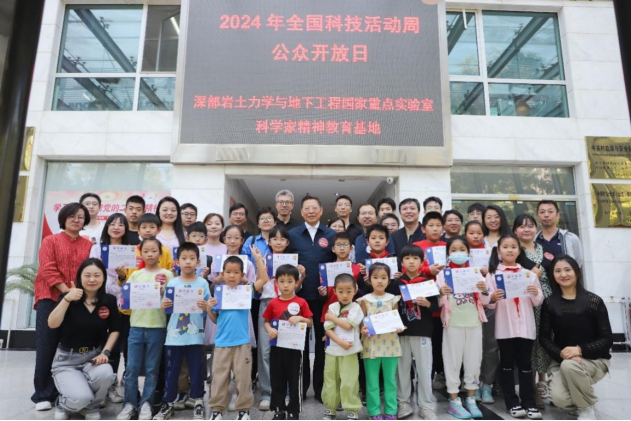 正值2024年全国科技工作者日与全国科技活动周,5月26日,“深部岩土力学与地下工程国家重点实验室科学家精神教育基地”(以下简称“基地”)开展的公众开放日活动,迎来了一批中小学生及科研工作者,共同开启了一场以弘扬科学家精神、播撒科学的种子、点亮科技智慧之光的研学之旅。实验室主任何满潮院士,副主任刘冬桥、黄蓉等出席了活动,并与参观团队合影留念,鼓励他们在今后的学习和生活中继续发扬科学家精神,追求科学梦想。
