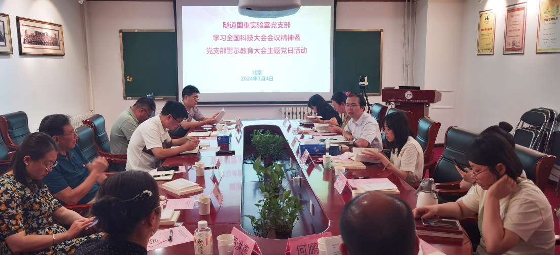 7月5日,隧道国重实验室党支部组织召开学习全国科技大会精神暨支部警示教育主题党日活动。党支部党员以线上、线下方式参加会议,部分实验室老师及职工列席会议。会议由党支部书记刘冬桥主持。