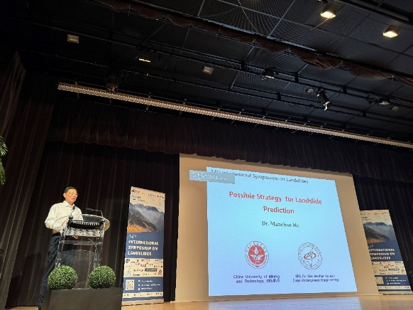 此次国际滑坡论坛共有9个特邀报告。其中,在闭幕式上,何满潮院士做了题为“Possible Strategy for Landslide Prediction”的报告。该报告围绕滑坡加固和智能监测预警这一科学难题,自主研发了适用于滑坡大变形防控的NPR锚索新材料,构建了基于NPR锚索、智能传感器和物联网的滑坡综合监测预警系统,实现了滑坡全寿命周期的加固和监测预警协同。报告后,国外专家与中国专家学者就地震滑坡、泥石流、高速滑坡动力学等研究成果学术交流。