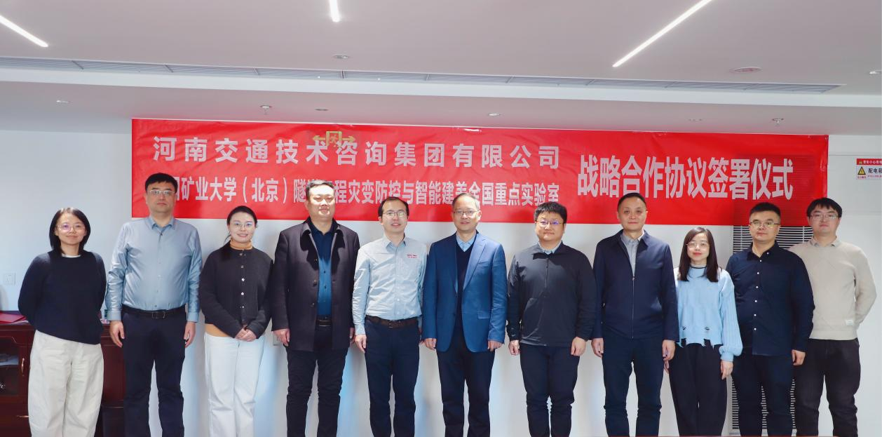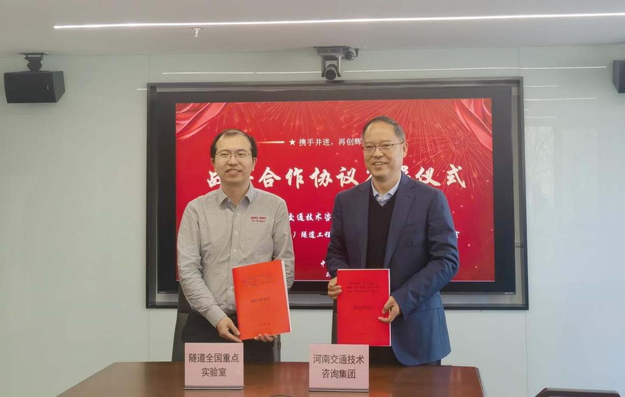 2025年1月6日,隧道工程灾变防控与智能建养全国重点实验室与河南交通技术咨询集团有限公司在隧道国重总部大楼签署战略合作协议。河南交通技术咨询集团党委书记、董事长赵志刚,总经理、党委副书记、副董事长张兵,隧道国重执行主任陶志刚,书记、执行副主任刘冬桥等出席签约仪式。