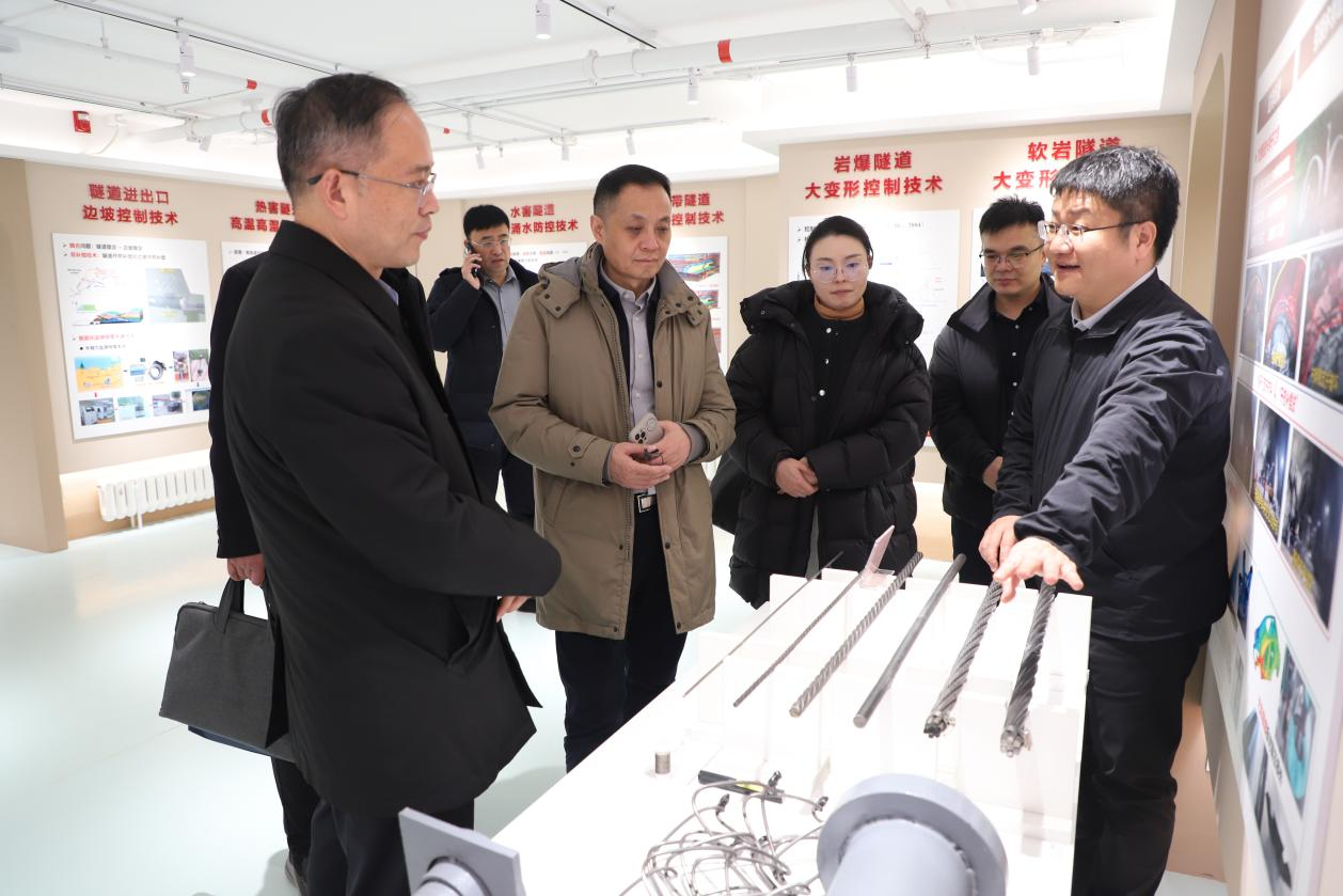 签约仪式前,陶志刚主任陪同赵志刚董事长一行参观了隧道国重实验室总部大楼展厅,通过实地参观和详细讲解,来宾们对实验室在岩体工程灾害防控及新材料研发等方面的最新成果和应用案例有了更加直观和深入的了解。
