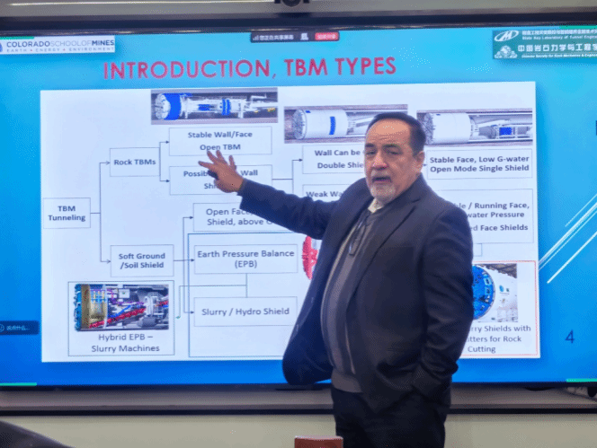 1月8日下午,在实验室副教授Lohrasb Faramarzi的主持下,Rostami教授作了本次系列讲座的第一场报告,题为 “岩石隧道掘进机(TBM)性能预测”。报告系统阐释了影响TBM掘进效率的关键地质与机械参数,并分享了基于工程数据的性能预测模型构建方法。