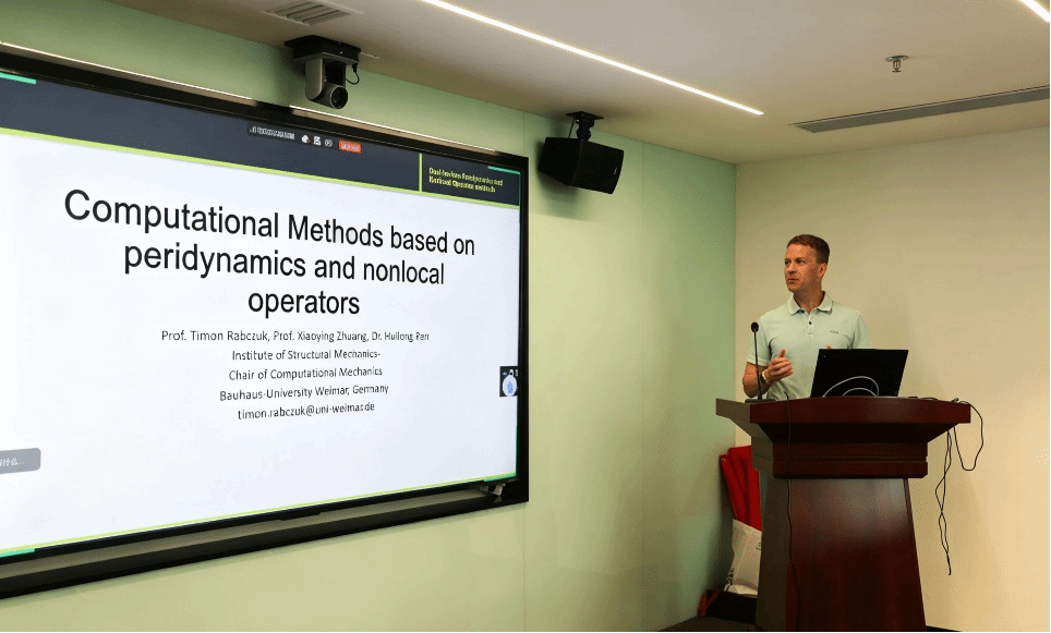 Timon Rabczuk院士以“Computational Methods Based on Peridynamics and Nonlocal Operators”为题,系统介绍了对偶horizon近场动力学、对偶支持光滑粒子流体动力学及非局部算子方法等原创性成果,为非局部计算力学建立了统一的数学框架。该方法已成功应用于断裂力学、梯度弹性、薛定谔方程及Cahn-Hilliard相场模型等广泛物理问题。