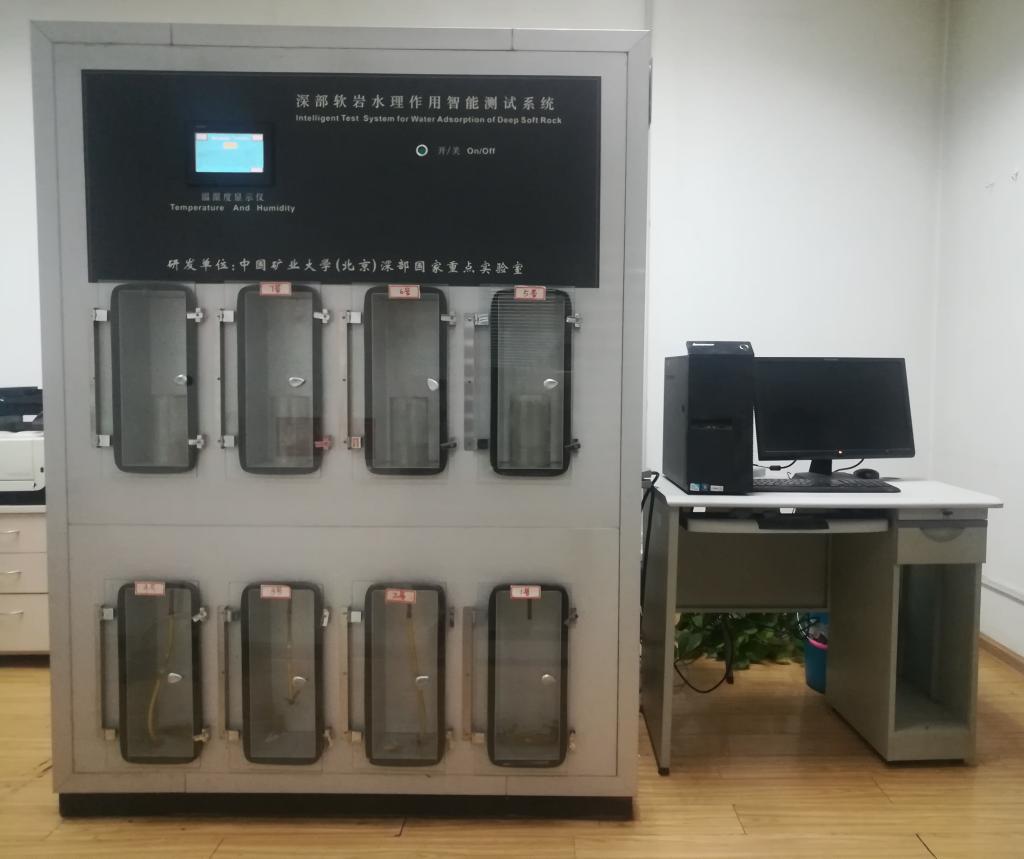 深部软岩水理作用智能测试系统主要由主体试验箱、称重子系统、温湿度监控和数据采集系统组成,是模拟煤矿现场岩石吸水环境和探讨岩石内部粘土矿物(例如蒙脱石等)形成不饱和电场的吸水机理的新一代智能系统,可以实现大批量实验的统一化操作,并能随时监测实验环境中温度和湿度的变化;实现岩石在有水压和无水压作用下的吸水实验过程中吸水曲线的实时显示及吸水实验数据存取的智能化。